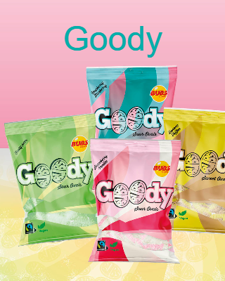 Sour foam candies with a mixture of raspberry and blueberry flavours that are made without animal products and the sugar is Fairtrade certified.